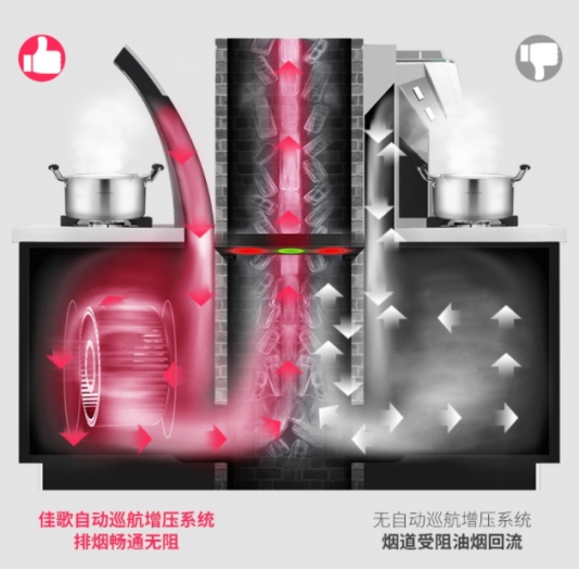 佳歌集成灶采用自動(dòng)巡航增壓科技,通過檢測(cè)和增壓的實(shí)時(shí)聯(lián)動(dòng),保證自己的煙機(jī)排風(fēng)壓高于公共煙道以及別人的排風(fēng)壓。超過420pa的排風(fēng)壓遠(yuǎn)高于公共煙道內(nèi)的高峰風(fēng)壓,確保順暢排煙。