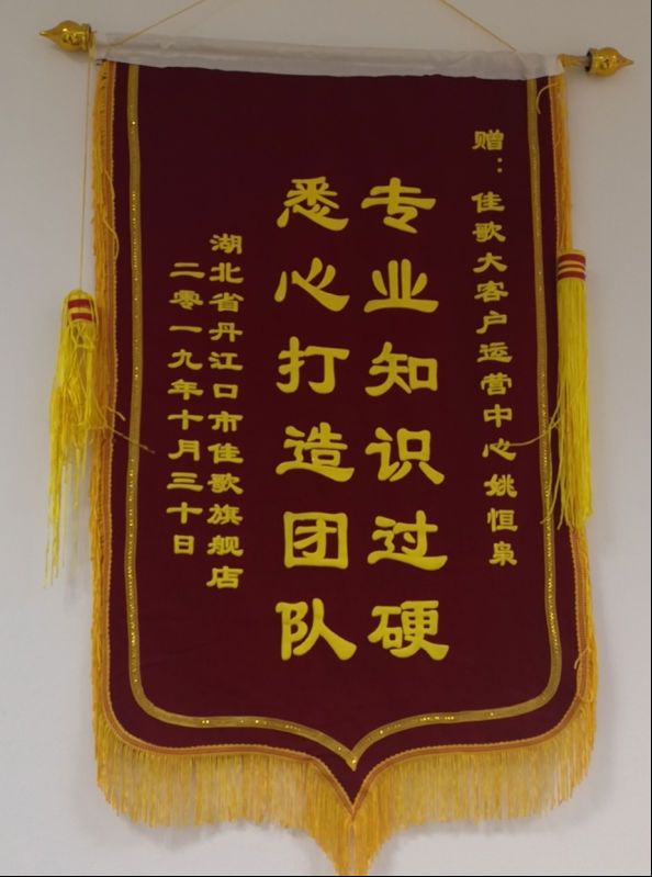 丹江口經(jīng)銷商為感謝佳歌大客戶運(yùn)營(yíng)中心對(duì)此次活動(dòng)的悉心幫扶,特送來錦旗一面。加上之前獲得的三面錦旗,佳歌集成灶大客戶運(yùn)營(yíng)中心在成立短短時(shí)間內(nèi),已經(jīng)擁有四面錦旗。