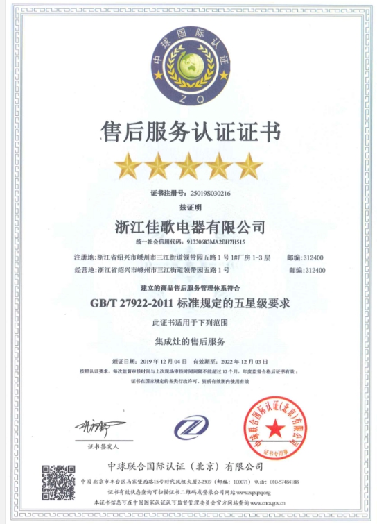 通過認(rèn)證意味著佳歌集成灶擁有完善的服務(wù)體系并得到良好運(yùn)轉(zhuǎn);意味著佳歌在全國和全行業(yè)中服務(wù)領(lǐng)先,在品牌與信譽(yù)上有著極大優(yōu)勢。