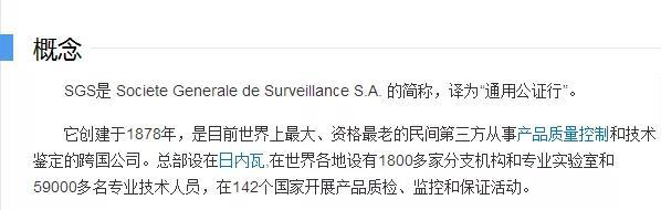 SGS創(chuàng)建于1878年,是目前世界上最大、資格最老的民間第三方從事產(chǎn)品質(zhì)量控制和技術(shù)鑒定的跨國(guó)公司??偛吭O(shè)在日內(nèi)瓦,在世界各地設(shè)有1800多家分支機(jī)構(gòu)和專業(yè)實(shí)驗(yàn)室和 59000多名專業(yè)技術(shù)人員,在142個(gè)國(guó)家開展產(chǎn)品質(zhì)檢、監(jiān)控和保證活動(dòng)。所以,從權(quán)威性這個(gè)角度,SGS完全值得信賴。