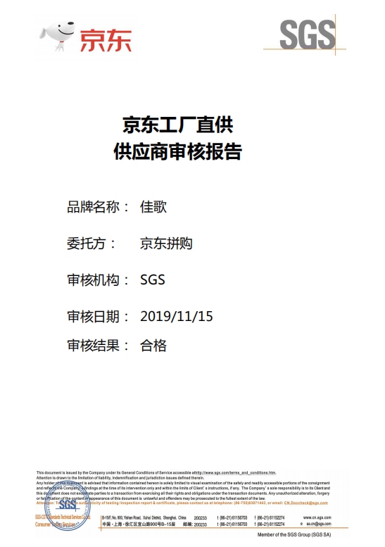此次,為京東拼購(gòu)能更廣泛引入和扶持工廠型商家,具有優(yōu)質(zhì)供應(yīng)鏈的工廠型商家進(jìn)行深度戰(zhàn)略合作,成為工廠直供認(rèn)證商家。拼購(gòu)專門對(duì)此做了一個(gè)產(chǎn)品檢驗(yàn)和驗(yàn)廠入駐,而佳歌在此次檢測(cè)最后成績(jī)?cè)u(píng)定為優(yōu)。