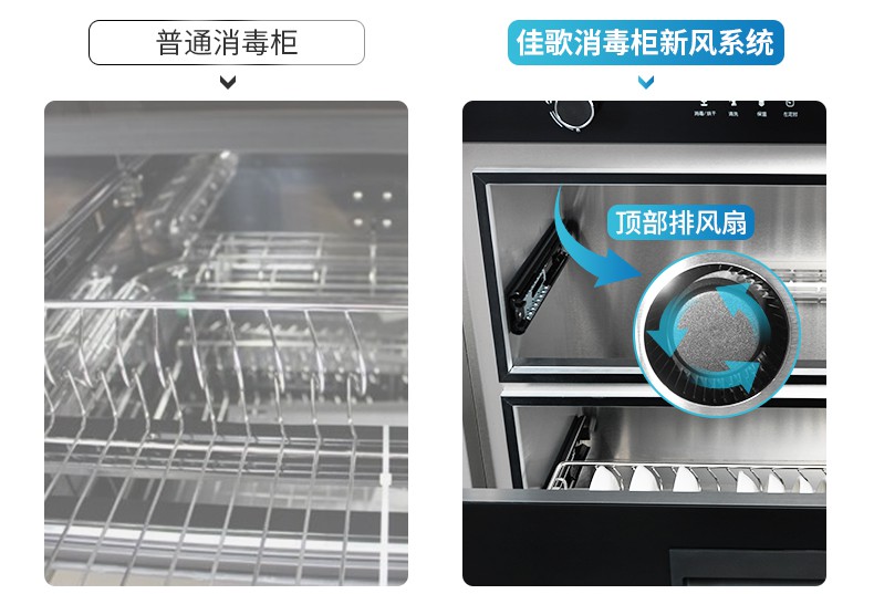 佳歌所有消毒柜款集成灶都搭載有新風(fēng)系統(tǒng)消毒柜頂部均有配備排風(fēng)扇,消毒烘干結(jié)束自動開啟30分鐘排氣,排出柜內(nèi)水蒸氣,消除臭氧異味。讓所有使用者打開柜門永遠(yuǎn)都是清新空氣。