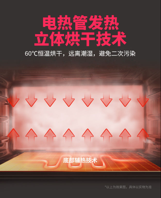 消毒柜采用烤箱式底部立體烘干技術(shù),加熱管延綿整個消毒柜底,烘干范圍更廣。